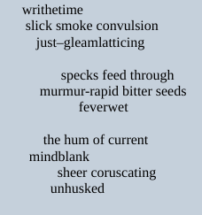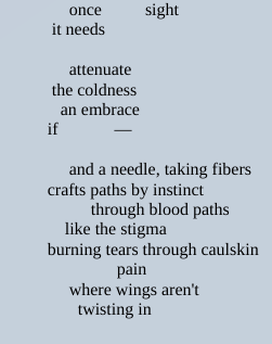 a small reel of wingeater poetry from 2023-2024, in broken fragments of color and pain and need, decades into writing silence-first.